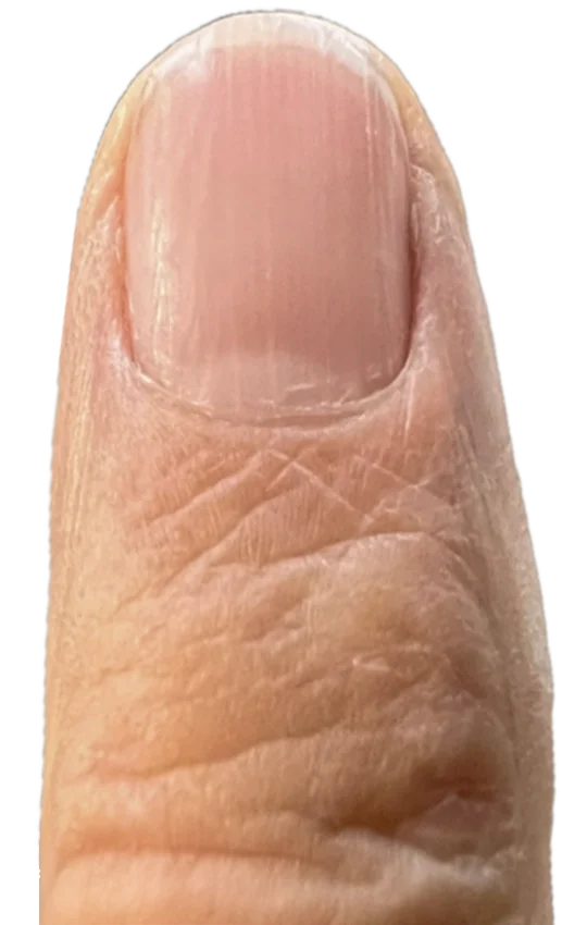 Während das frühere Bild (links) noch feine und teils verdickte Falten an der Haut des Fingerendglieds zeigt, wirkt die Haut des verjüngten Zeigefingers – abgesehen von den natürlichen Beugefalten – deutlich glatter – nahezu faltenfrei.